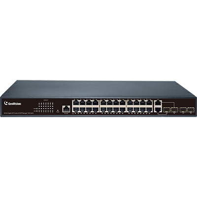 The GV-APOE2412 is a 24-port 10/100/1000BaseT(X) PoE+ Web Managed switch, featuring 4 SFP uplink ports and 2 combo ports. This switch supports the IEEE 802.3af/at Power over Ethernet standard, providing a maximum PoE budget of 370 W. It eliminates the need for power cables to connect powered devices (PD), such as IP cameras, and allows for power delivery over network cables up to 250 meters (820 feet) in length at a 10 Mbps transfer rate.